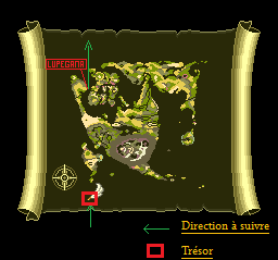 Avant de continuer votre route, vous pouvez, maintenant que vous avez la world map, aller chercher le trésor englouti que réclame un homme de Lupegana. Il vous donnera quelque chose en échange. Pour trouver ce trésor, il vous suffira de partir de Lupegana en bateau et de vous diriger au large en suivant strictement la direction du nord jusqu’à ce que vous aperceviez une petite zone étincelante. C’est là que se trouve le trésor, placez vous sur cette zone et lancez la recherche (Attention : l’endroit où se cache le trésor ne saute pas aux yeux, le lieu est marqué seulement par de petits scintillements)