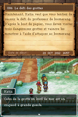 Description : Katia, une élève, aimerait que vous battiez les monstres-maîtres dans 3 grottes, elle vous dit que il y a des indices dans l'école. Les monstres-maîtres doit périr du boomerang. |