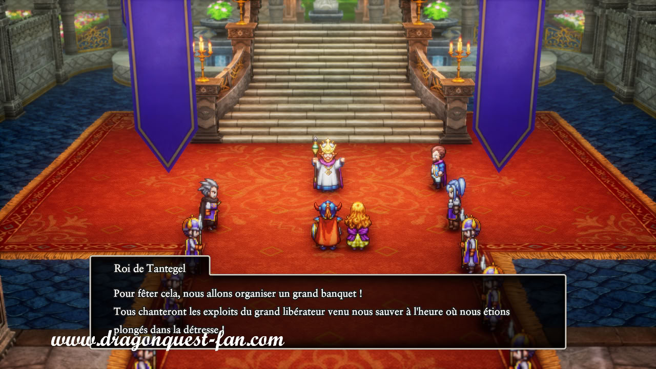 Tout Tantegel célèbre votre victoire à l'occasion d'un grand banquet organisé par le roi en personne. Cependant, à la nuit tombée, la princesse vous rejoint sur la terrasse du château. Rubiss vous adresse alors ses remerciements mais avoue que la lutte contre les forces du Mal est loin d'être terminée. Gwaeline lui promet que vous ferez de votre mieux pour que le monde soit peuplé d'âmes héroïques qui seront peut-être, un jour, à leur tour amenées à sauver le monde. Vous remettez enfin les cinq sceaux à Rubiss en espérant que personne n'aura à s'en servir de sitôt.