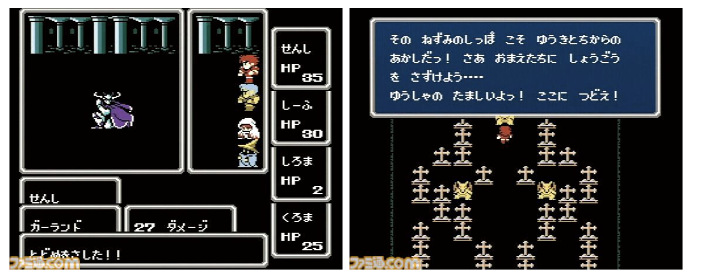 Horii : Ah... Ce qui m'a le plus impressionné dans FF, c'est la gestion des équipiers. Dans DQ, quand un membre de l'équipe tombe au combat, il se transforme en cercueil. Si une scène narrative se déclenche à ce moment-là, c'est un casse-tête : il faut prévoir le cas où l'équipier est là et celui où il est dans son cercueil. Mais dans FF, ils sont juste "K.O." (donc on n'a pas ce problème). Je me suis dit : "Ah ! Mais c'est génial !" (rires). Puisqu'ils sont juste hors de combat, ils peuvent quand même apparaître dans les cinématiques.