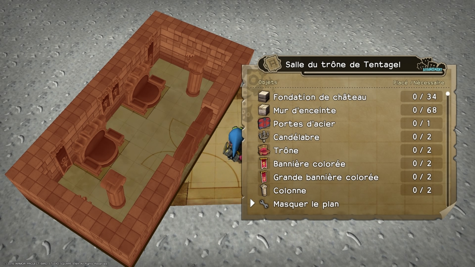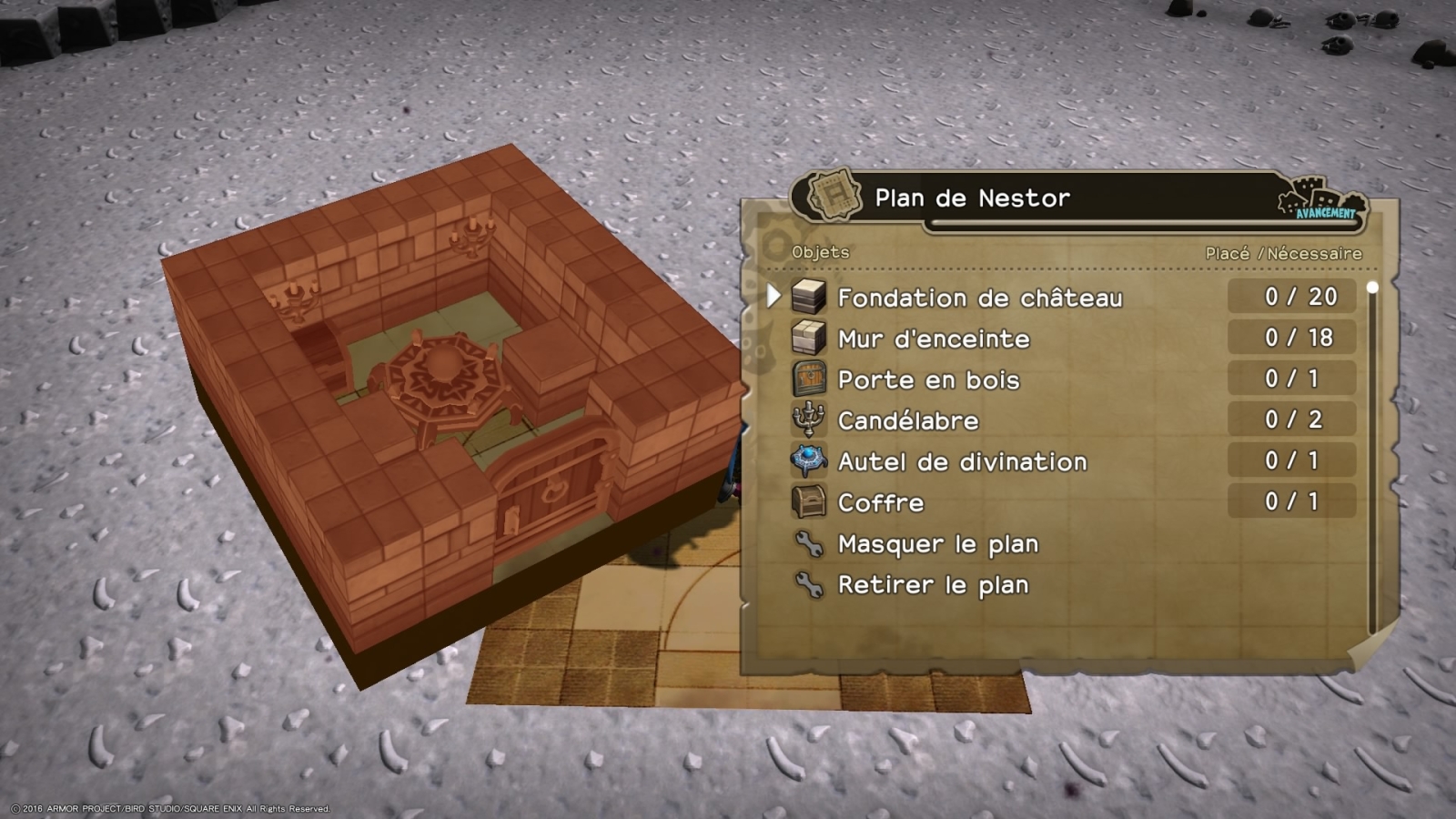 Pour ces trois quêtes, vous remarquerez qu’au sol est présent un vague marquage qui vous indique un agencement pour les salles que vous devrez ou pourrez construire, mais vous n’êtes pas obligés de suivre ce marquage.